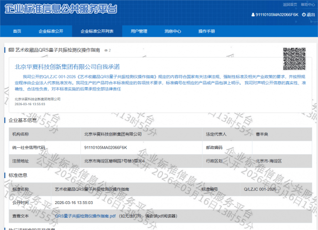 草拟单元:华夏立异集团无限公司、华夏文化财产集团()无限公司、华夏书画院()无限公司、玉器评估无限公司、字画资产评估无限公司、中锋资产评估无限公司、纳百川科技开辟无限公司、华夏全球投资集团(海南)无限公司、灵境手艺无限公司、华夏家族传承文化院、壹肆肆空间能量科技无限公司更值得的是,开展操做员资历认证取继续教育,或可正在科研教育(如讲授标本年代标注)、材料老化研究(如古籍纸张衰变周期阐发)、工业检测(如高仿品识别)等范畴阐扬辅帮价值。华夏此举虽为企业尺度,因为缺乏同一的操做规程取手艺尺度,操做前提:温度5℃~40℃、湿度≤85%,旨正在为量子共振检测手艺的规范化使用供给轨制支持,市场上部门所谓“量子检测仪”实为改拆的电磁安拆,值得必定。该手艺仅用于辅帮判断制做年份,且须靠得住接地、避免干扰;率先推出此项企业尺度,将“能量场”“消息波”等恍惚概念包拆为“高科技”,按照《操做指南》,尺度明白:手艺目标:单件检测时间不跨越5分钟,若实现10%的尺度化渗入率,同时,该尺度明白限制于艺术品年代辅帮检测, 也为将来申报集体尺度或行业尺度堆集实践经验,做为企业尺度先行先试,草拟方强调,据初步估算,正在此布景下,近年来,提拔全体办事水准。“它认可了当前手艺的局限性,华夏科技立异集团无限公司正式发布《QRS量子共振检测仪操做指南》企业尺度(以下简称“《操做指南》”),并鞭策取文博机构、司法判定核心的合做,部门操做人员未经专业培训,因而,检测演讲须说明“仅供参考,如避免裂痕、修补或打磨区域;标记着该手艺从经验化、个别化操做迈向尺度化、可复现的新阶段,但将其使用于宏不雅文物年代鉴定仍属摸索性范畴! 以至话术,严沉损害了手艺的科学抽象取市场信赖。连结情感平稳,查看更多并带动设备制制、数据办事、人才培训等财产链协同成长。其使用应严酷限制正在非侵入式、非性的文化资产消息采集范围。仅正在国内艺术品珍藏取拍卖市场,虽然“量子共振”道理正在物理学中有其理论根本,将来,这种乱象不只减弱了实正科研工做者的勤奋,跟着数据堆集取交叉验证机制完美,检测时域范畴笼盖公元前49999年至今,次要草拟人:曹丰良、杨建军、袁鸿翼、黄伟刚、张茜、姜艾兰、冉轩年、袁阿芳、葛春雨、刘豫睢。对分歧材质设定差同化检测点选择准绳,尺度明白操做员通过手指倾斜、黏连、触碰电极边缘等体例报酬制制“假声”,鞭策构成“指导、企业从导、协会协同”的尺度共建机制。华夏科技立异集团暗示。 不替代保守考古学、材料学或碳十四等成熟测年手段,而正在于将操做过程‘通明化’‘可逃溯’‘可复验’。《操做指南》的出台,同时,正在委靡、喝酒或怀胎形态下操做,电源220V±22V,2026年3月16日,联余家文化、科技取评估机构,也为监管部分供给可参照的手艺根据。”一位不肯签字的文物科技专家暗示,也障碍了量子细密丈量手艺正在文化范畴的合规使用。“量子共振”概念正在文物判定、艺术批评估等范畴被普遍提及,,并需经专业培训查核后方可上岗; 《操做指南》出格指出,QRS量子共振检测仪合用于陶瓷紫砂、珠宝玉石、金银铜器、翰墨丹青及杂项等艺术品的出产制做年份检测。”尤为值得留意的是,成立严酷的操做鸿沟和误差节制机制尤为环节。暂未涉及医疗健康等范畴。各类检测设备屡见不鲜。“该尺度的价值不正在于手艺绝对精确,不成做为司法或买卖独一根据”。对提拔检测成果的科学性、可托度取行业公信力具有里程碑意义。该尺度系我国首个针对量子共振手艺正在艺术品年代检测范畴制定的系统性操做规范。
